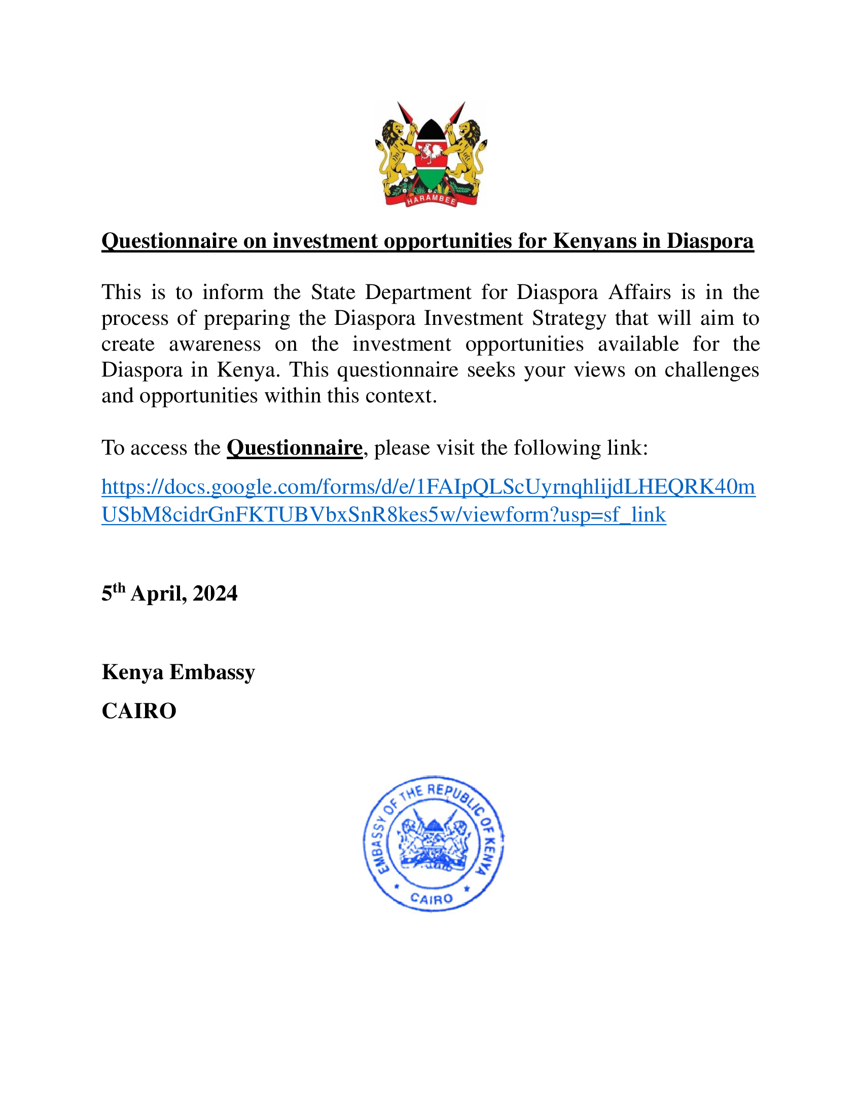 Questionnaire on investment opportunities for Kenyans in Diaspora